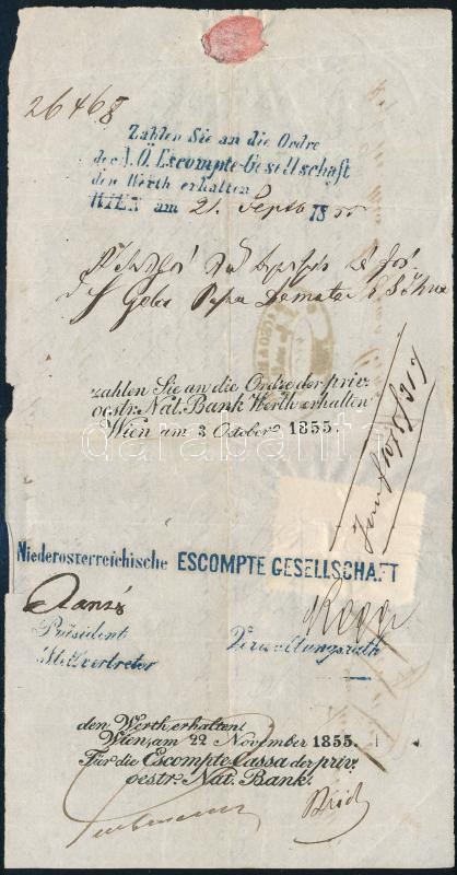 Beschreibung: 1855 30 kr okmánybélyeg a Macso & Manno (Macsó György - Mannó István) pesti székhelyű szállítmányozási cég német nyelvű fizetési csekkjén, a cég bélyegzőjével