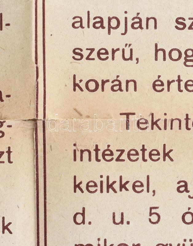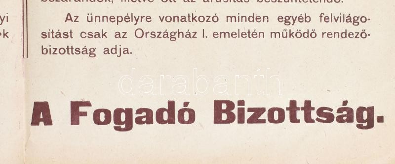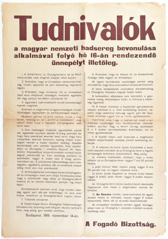Beschreibung: 1919 Bp., Tudnivalók a magyar nemzeti hadsereg bevonulása alkalmával rendezendő ünnepélyt illetőleg, hirdetmény, szakadásokkal, 66×47 cm