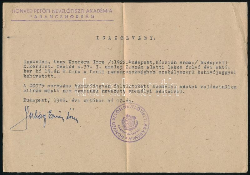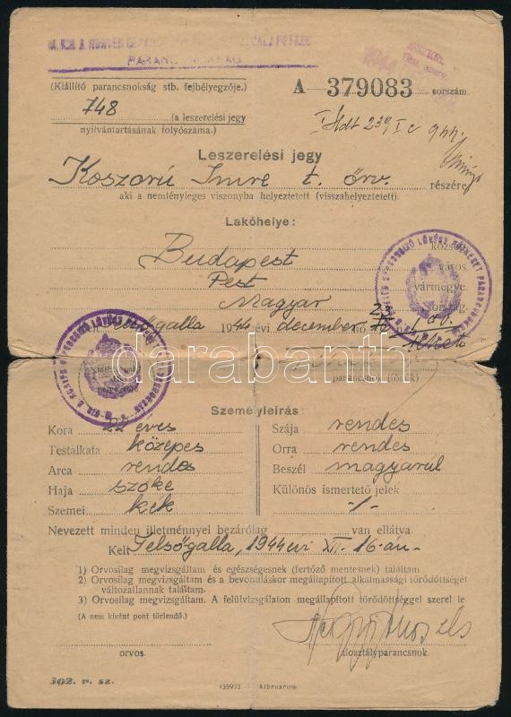 1944 Felsőgalla, 1948 Budapest, 2 db katonai irat (igazolvány, szelvén... https://www.darabanth.com/de/411-Fernauktion/411.0/Kunst-Dokumente-andere-Sammelgebiete/Militaria~505029/1944-Felsogalla-1948-Budapest-2-db-katonai-irat-igazolvany-szelveny-leszerelesi-jegyhez~II2555000