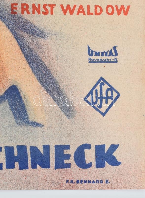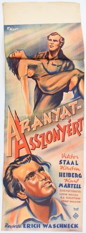 Aranyat asszonyért. Moziplakát (filmplakát, rácsplakát), 1939. Viktor Staal, Kirsten Heiberg, Karl Martell és mások szereplésével. Ufa. Litográfia, papír. P Kiss jelzéssel a litográfián. Rovenszky kőnyomda. Lapszéli apró sérülésekkel, felső részén kissé foltos. Hajtásnyomokkal. 94×31 cm / Vintage Hungarian poster of the German Ufa movie "Frauen für Golden Hill", with very small damages on the edges, lithography on paper.