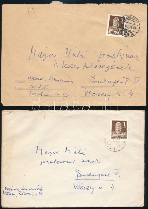 1971-1972 Weöres Sándor (1913-1989) és felesége Károlyi Amy (1909-2003) által Major Máté (1904-1986) Kossuth-díjas építész részére címzett borítékok, "Weöres Sándorék" feladó címzéssel