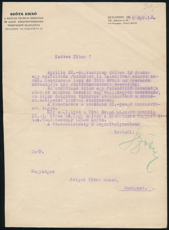 Beschreibung: Szőts Ernő,(1884-1932) a Magyar Rádió első igazgatójának autográf aláírással ellátott levele a rádió fejléces levélpapírján
