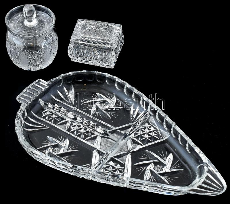 Beschreibung: Kristály / üveg mártogatós szett, kopásnyomokkal, 29x17cm, m:6-10cm