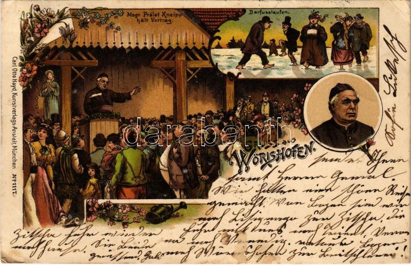 Beschreibung: 1903 Bad Wörishofen, Barfusslaufen, Msgr. Prälat Kneipp hält Votrag. Carl Otto Hayd No. 1117. Art Nouveau, floral, litho (EK)