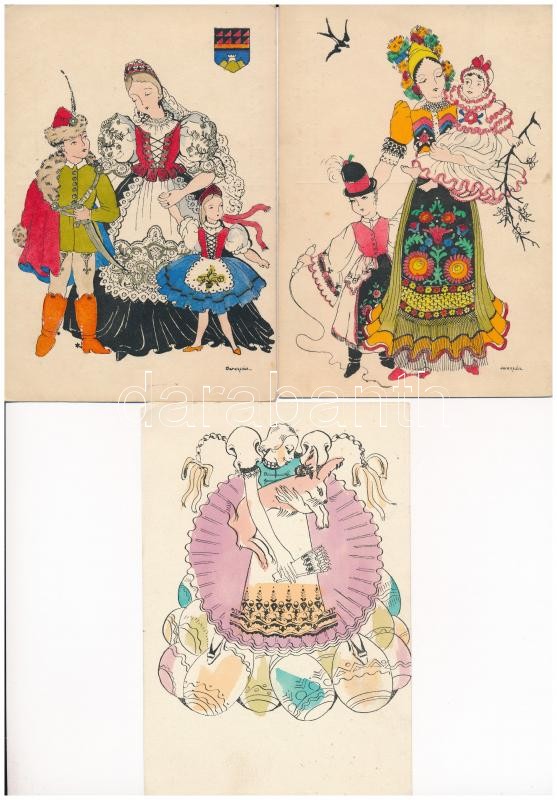 Beschreibung: 3 db RÉGI kézzel rajzolt magyar népviseletes művész képeslap / 3 pre-1945 hand-coloured Hungarian folklore postcards
