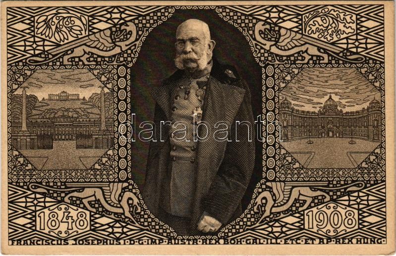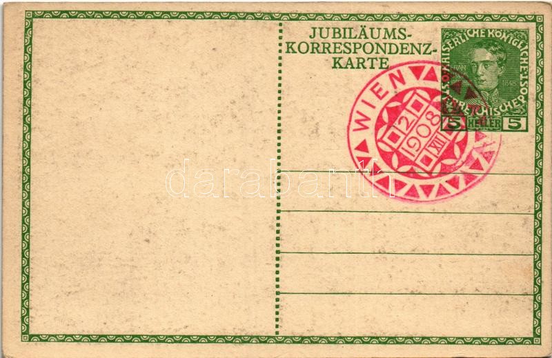 1848-1908 Franciscus Josephus I.D.G. Imp. Austr. Rex Boh.Gal.Ill. Etc. et. Ap. Rex Hung. / Ferenc József uralkodásának 60. évordulója, jubileumi díjjegyes lap / Franz Joseph's 60th anniversary of reign. Art Nouveau, Viribus Unitis. 5 Heller Ga. + WIEN 1908 So. Stpl