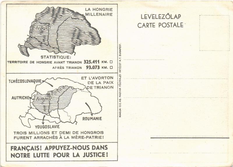 Beschreibung: Concorde tér Párizsban és a Szabadság tér Budapesten. Trianon szoborcsoport, Országzászló. Magyar Földrajzi Intézet rt. nyomása / Paris, Place de la Concorde - Budapest, Place de la Liberté; Hungarian irredenta propaganda, Trianon map on the backside (EK)
