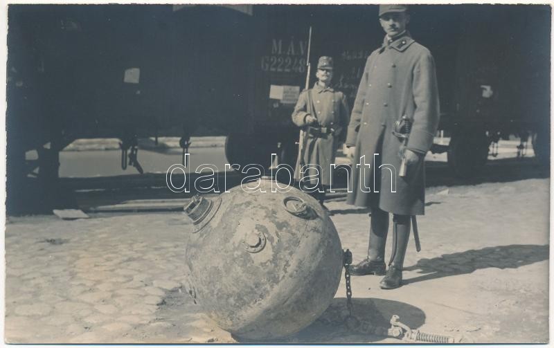 1915 Beograd, Belgrad; Aus der Save aufgefischte serbische Flussmine / Szávából kihalászott szerb folyami akna / WWI Austro-Hungarian Navy, K.u.K. Kriegsmarine, Serbian river mine fished out of the Sava river. photo
