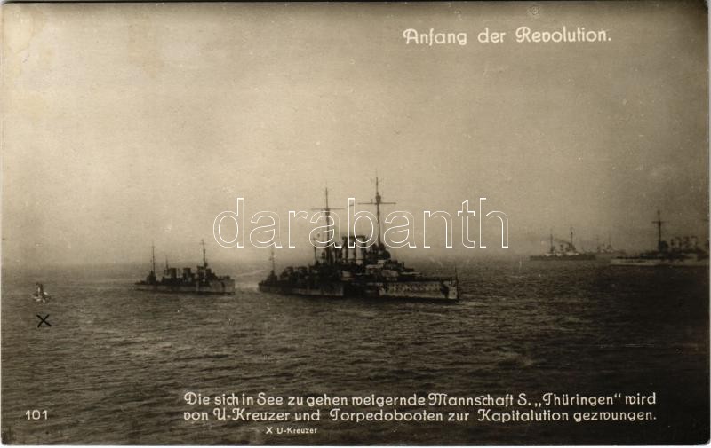 Anfang der Revolution. Die sich in See zu gehen weigernde Mannschaft s: Thürengen wird von U-Kreuzer und Torpedobooten zur Kapitalution gezwungen. Kaiserliche Marine / German Navy battleships