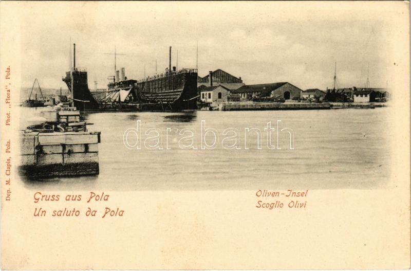 Beschreibung: Pola, Pula; Oliven-Insel / Scoglio Olivi / Olíva-sziget a hadihajógyárral / Austro-Hungarian Navy, K.u.K. Kriegsmarine shipyard. Dep. M. Clapis. Phot. "Flora" (fl)