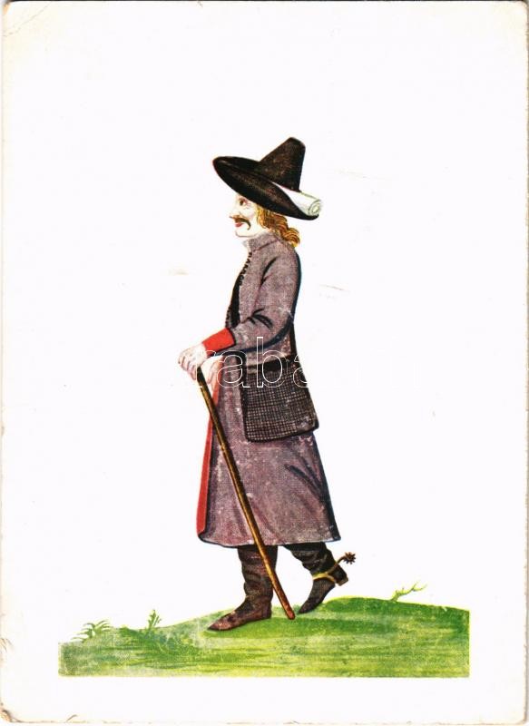 1848-1948 Falusi tanító. Színezett rajz a XVIII. századból. 1848 centenáriumára kiadott lap. Magyar Nemzeti Múzeum Országos Széchenyi Könyvtára (kis szakadás / small tear)