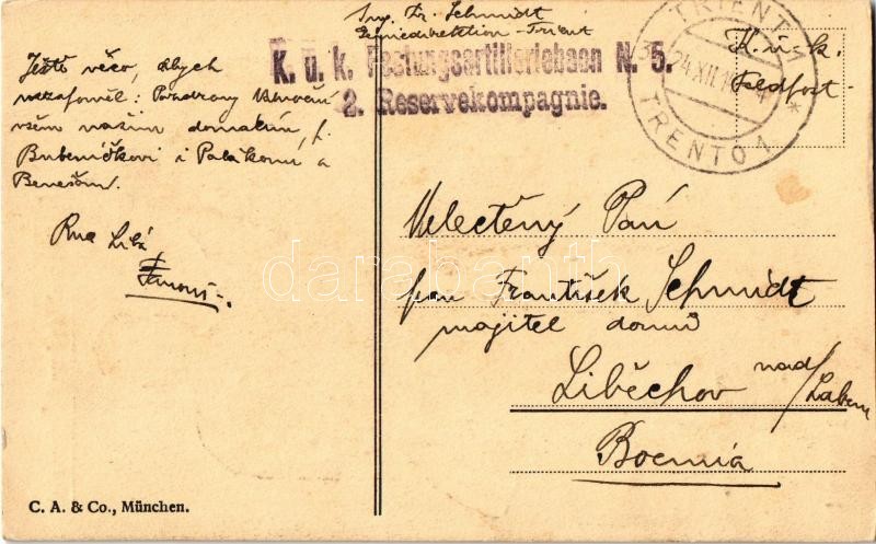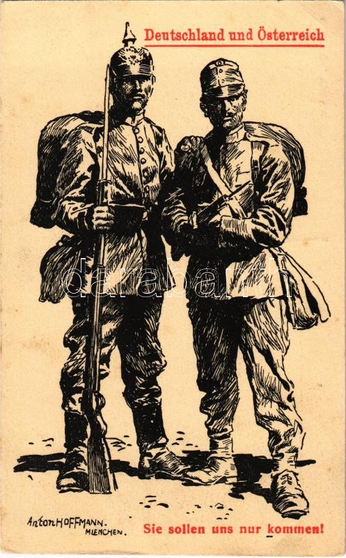 1914 Deutschland und Österreich. Sie sollen uns nur kommen! / WWI German and Austro-Hungarian K.u.K. military art postcard, Viribus Unitis propaganda s: Anton Hoffmann + "K.u.K. Fetsungsartilleriebaon Nr. 5. 2. Reservekompagnie" (EK)