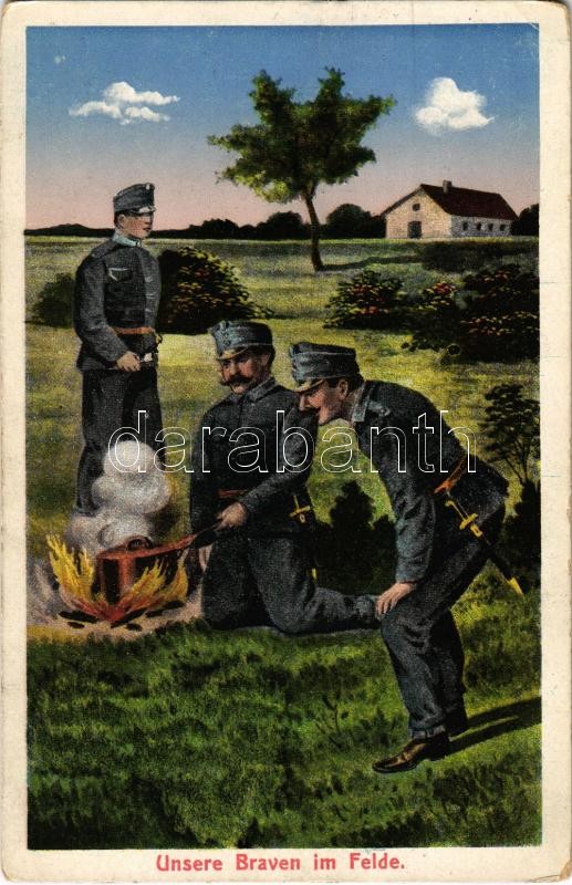 1916 Unsere Braven im Felde / WWI Austro-Hungarian K.u.K. military art postcard, soldiers on the field. M.M.S.W. III/2. + "K.u.K. Etappenstationskommando" (EK)