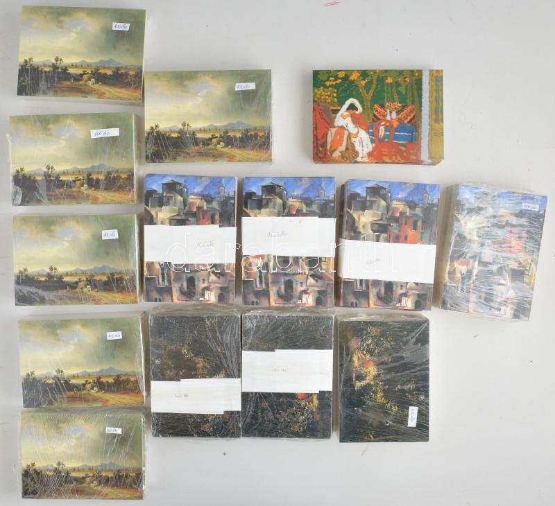 1356 db MODERN művész motívum képeslap, 5 változat ismétlődő példányokkal: bontatlan 100-as csomagok kitűnő minőségben / 1356 modern art motive postcards, 5 variants with duplicate copies, unopened packages of 100 in excellent quality