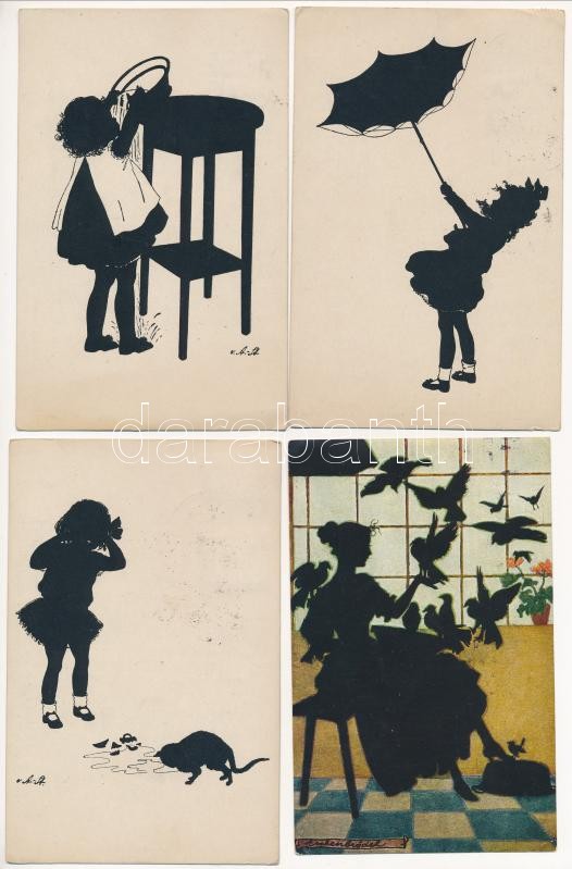 Beschreibung: 4 db RÉGI művész motívum képeslap: sziluett / 4 pre-1945 art motive postcards: silhouette