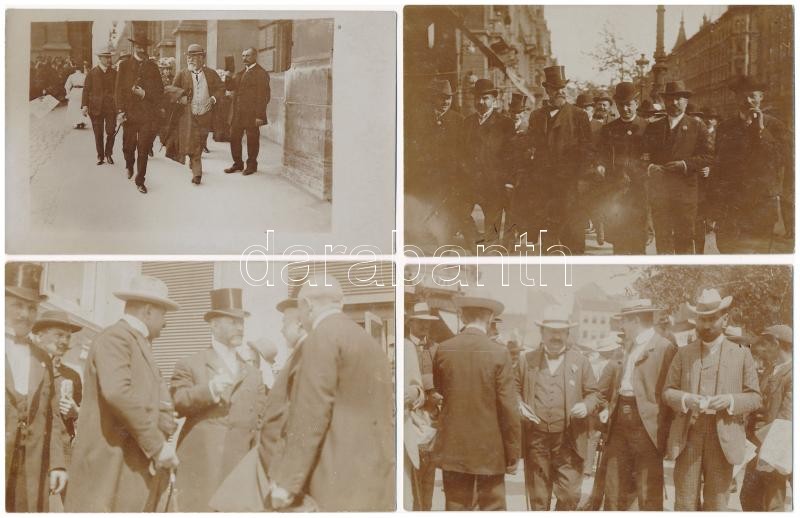 Beschreibung: 1907 Budapest, Osztrák-Magyar Kiegyezés megkötése alkalmából a kormánytagok és a parlament tagjai az utcákon - 4 db eredeti fotó