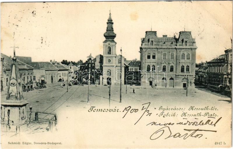 Beschreibung: 1900 Temesvár, Timisoara; Gyárváros, Kossuth tér, Brüder Kohn üzlete / Fabric, square, shops