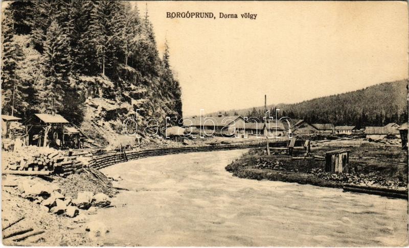 Beschreibung: 1918 Borgóprund, Borgó-Prund, Prundu Bargaului; Dorna-völgy, fűrésztelep. Sajovics Izidor kiadása / valley, sawmill (EK)