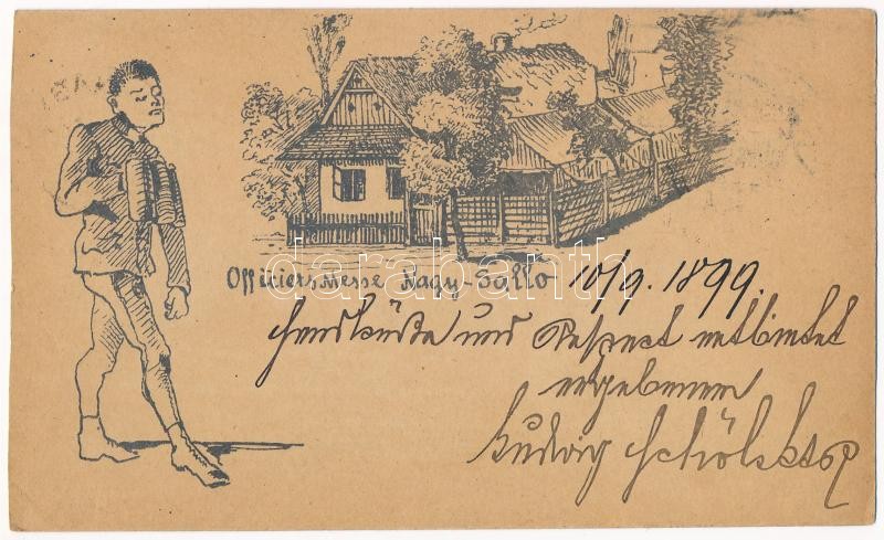 Beschreibung: 1899 (Vorläufer) Nagysalló, Tekovské Luzany, Tekovské Sarluhy; Officiers-Messe / kézzel rajzolt lap katonával / hand-drawn art postcard with K.u.K. soldier (vágott / cut)