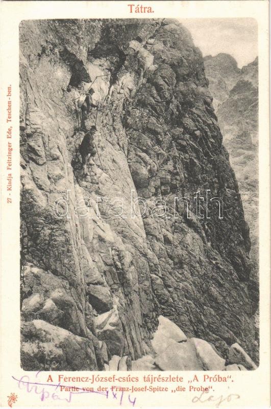 Beschreibung: 1901 Tátra, Magas-Tátra, Vysoké Tatry; Ferenc József-csúcs tájrészlete hegymászókkal. "A Próba". Feitzinger Ede 27. / Partie von der Franz-Josef-Spitze, "die Probe" / StÃt Frantiska Jozefa (Gerlachovsky stÃt) / mountain peak, mountain climbing in the High Tatras (EK)