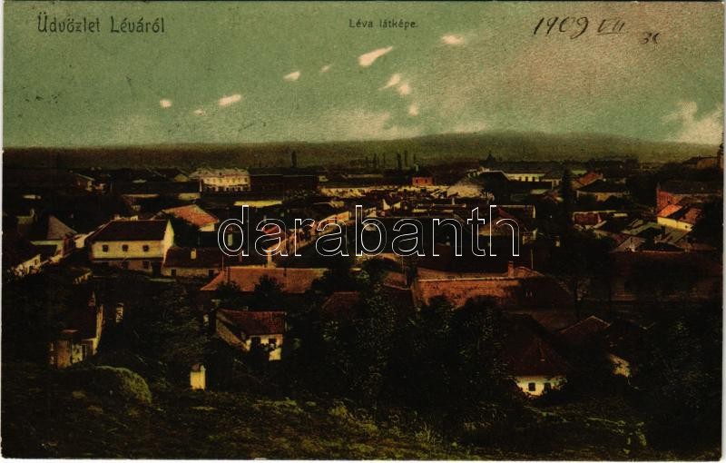 1909 Léva, Levice; látkép. Schulcz Ignác kiadása / general view https://www.darabanth.com/de/412-Fernauktion/412.0/Ansichtskarten/Slowakei~2000008/1909-Leva-Levice-latkep-Schulcz-Ignac-kiadasa-general-view~II2569281