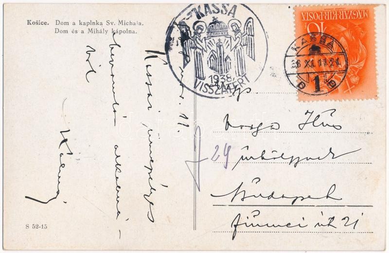 Beschreibung: 1938 Kassa, Kosice; Dom a kaplnka Sv. Michala / Székesegyház és Mihály kápolna / cathedral and chapel + "1938 Kassa visszatért" So. Stpl.