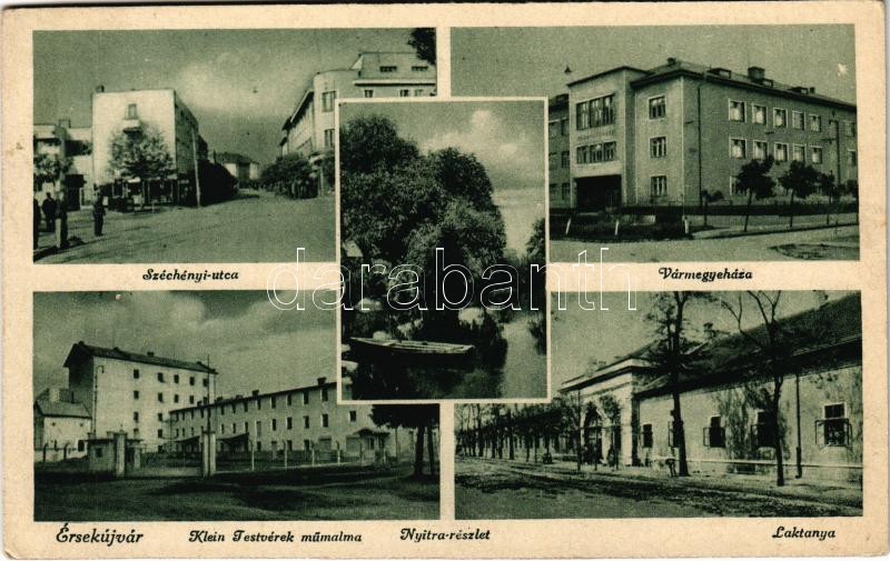 Érsekújvár, Nové Zámky; Széchenyi utca, Vármegyeháza, Nyitra részlet, Klein Testvérek műmalma, laktanya / street view, county hall, Nitra riverside, mill, Hungarian military barracks (EK)