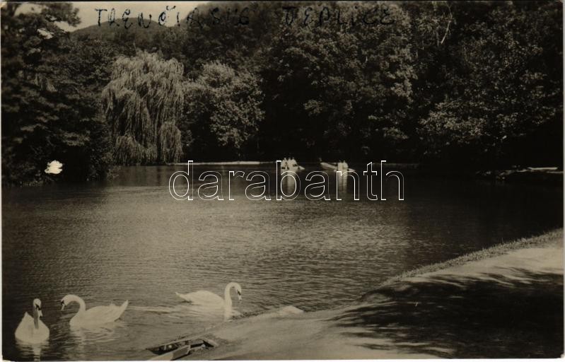 Beschreibung: Trencsénteplic, Trencianske Teplice; Labutie jazero na Baracke / tó, hattyúk / lake, swans (ragasztónyom / glue marks)