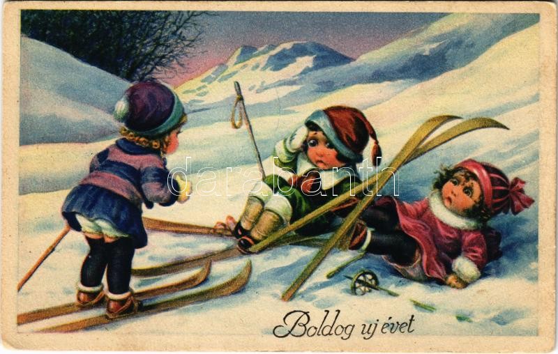 Boldog új évet, síbaleset / New Year greeting, skiing accident, winter... https://www.darabanth.com/de/412-Fernauktion/412.0/Ansichtskarten/Sport~2000083/Boldog-uj-evet-sibaleset-New-Year-greeting-skiing-accident-winter-sport-Cecami-n-4192~II2564147