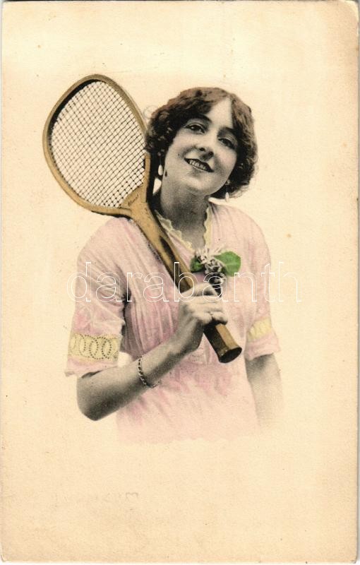 Hölgy teniszütővel / Lady with tennis racket, sport https://www.darabanth.com/de/412-Fernauktion/412.0/Ansichtskarten/Sport~2000083/Holgy-teniszutovel-Lady-with-tennis-racket-sport~II2565283