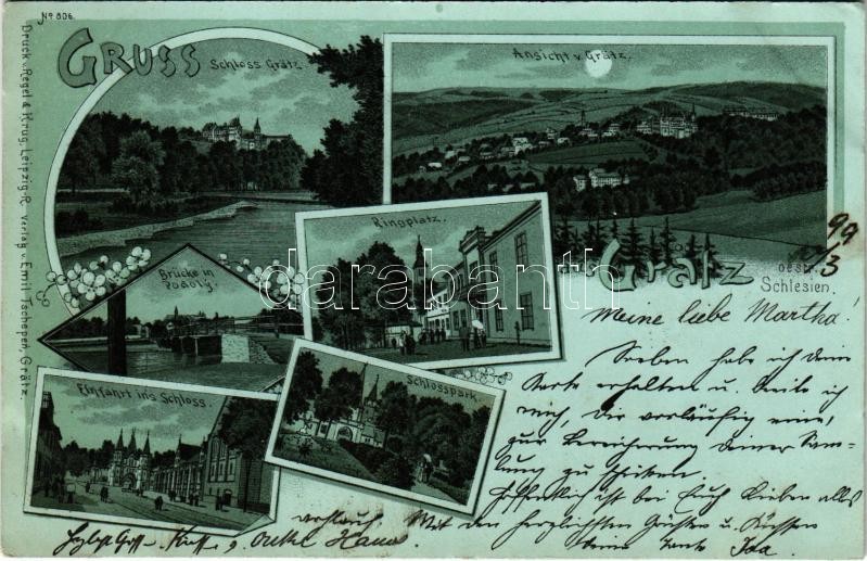1899 (Vorläufer) Hradec nad Moravicí, Grätz; Schloss, Ringplatz, Brücke in Podoly, Einfahrt / castle, square, bridge. Emil Tschepen Art Nouveau, floral, litho