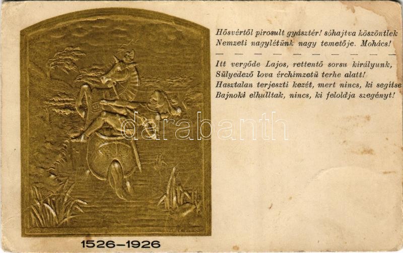 1526-1926 Mohácsi vész 400. évfordulójának dombornyomott emléklapja. A mohácsi síkon építendő Fogadalmi templom alapja javára. Kiss Gy. domborműve. Szeiler vésnök / 400th anniversary of the Battle of Mohács, charity card Emb. + So. Stpl. (EB)