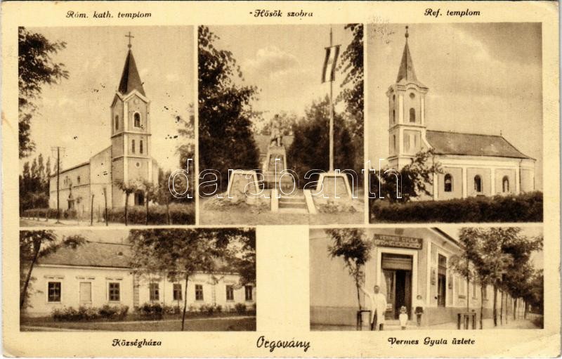 Beschreibung: 1942 Orgovány, Római katolikus templom, Hősök szobra, emlékmű, Országzászló, Református templom, Községháza, Vermes Gyula üzlete (EK)