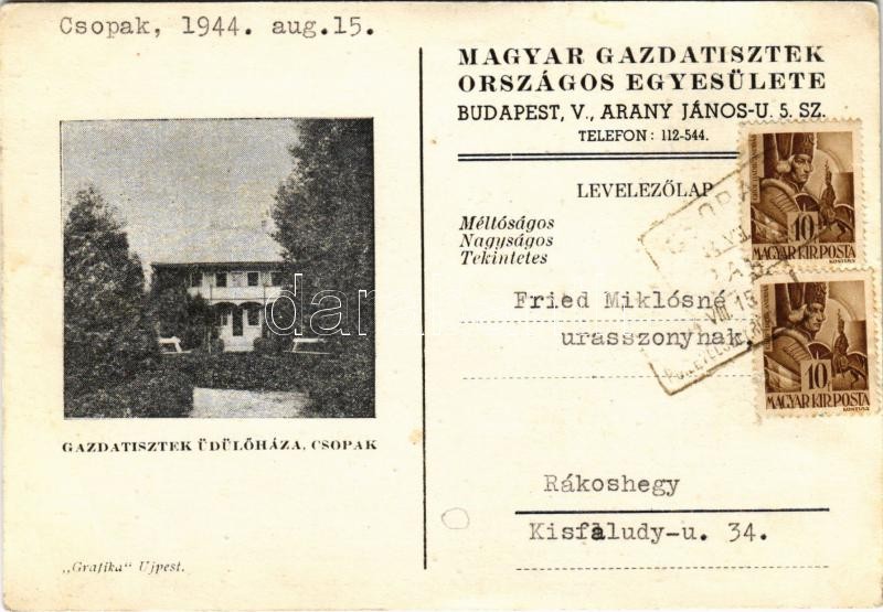 Beschreibung: 1944 Csopak, Magyar Gazdatisztek Országos Egyesülete Gazdatisztek üdülőháza + "P.U. Levélszekrényből" (EK)