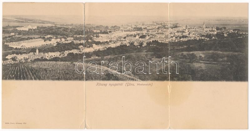 Beschreibung: Kőszeg, 3-részes kihajtható panorámalap. Róth Jenő kiadása (hajtásnál szakadt / torn at fold)