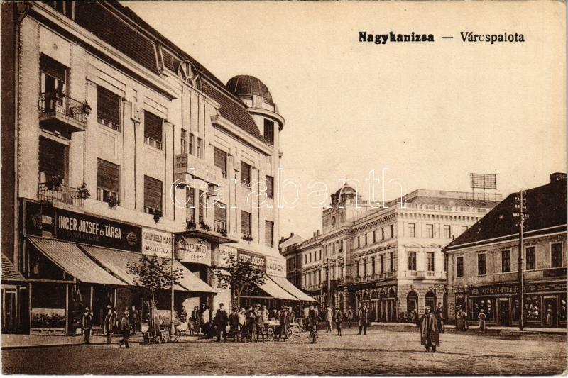Nagykanizsa, Várospalota, Inger József és Társa divatáruk, Grünfeld Már., Stern József és Weiszfeld és Fischer üzlete, Központi szálloda és étterem. Vasúti levelezőlapárusítás 3934.