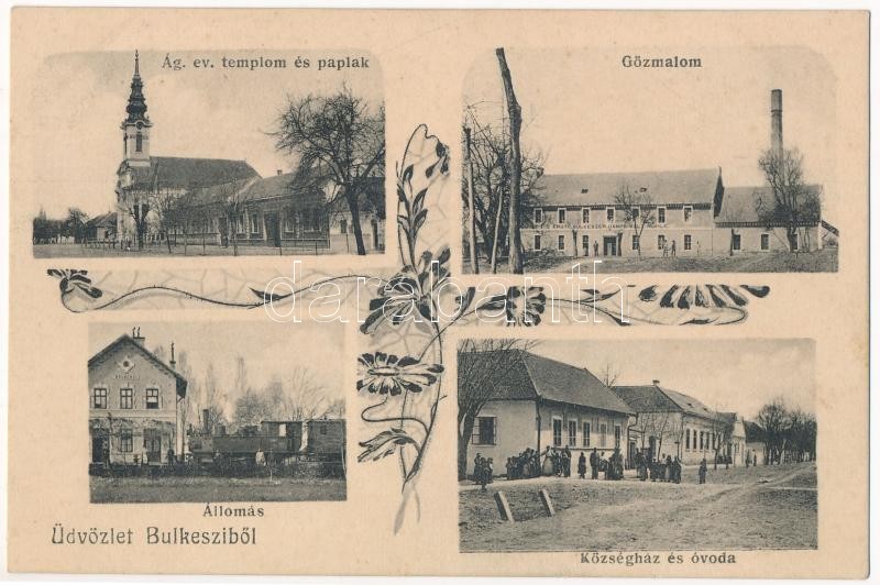 Bulkesz, Bulkeszi, Maglic, Backi Maglic; Vasútállomás, gőzmozdony, vonat, Evangélikus templom és paplak, Gőzmalom, Községháza és óvoda. Elicker kiadása / railway station, locomotive, train, Lutheran church and parsonage, steam mill, town hall, nursery. Floral (fl)
