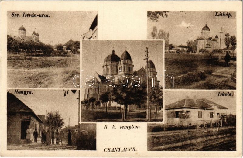 Beschreibung: Csantavér, Cantavir; Római katolikus templom, iskola, Szt. István utca, Hangya üzlete / church, school, street, shop