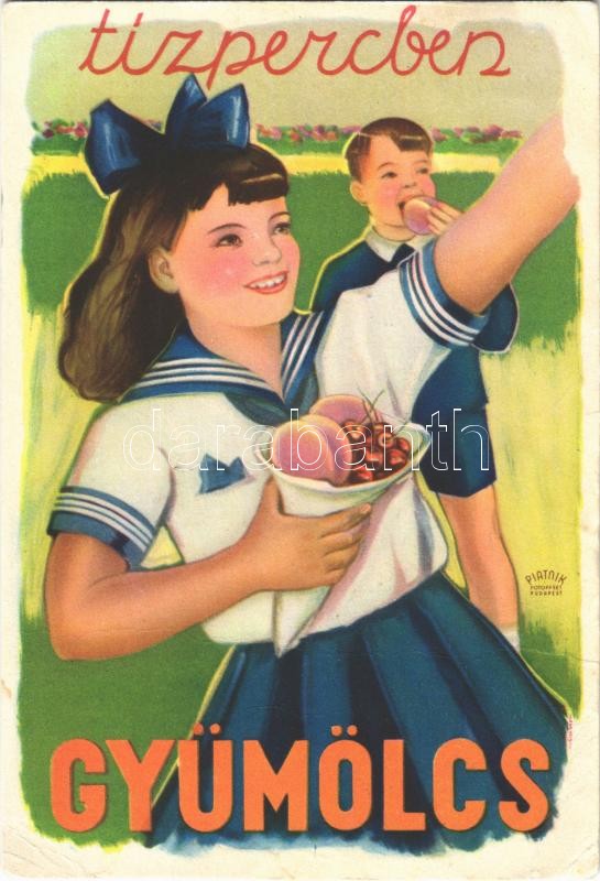 Tízpercben gyümölcs! Magyar egészségügyi propaganda, C-vitamin táblázat a hátoldalon. M. kir. Földművelésügyi Minisztérium kiadványa / Hungarian health campagin propaganda, C-Vitamin chart on the backside s: Vöczköndy (EK)