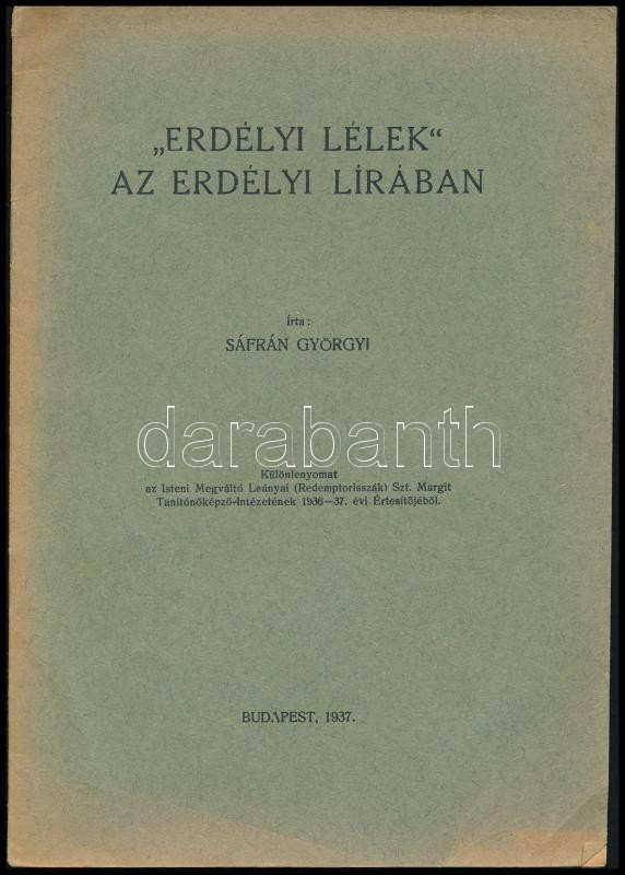 1937 Sáfrán Györgyi: "Erdélyi lélek" az erdélyi lírában. Különlenyomat. Bp., 1937., "Élet-ny.", 17 p. Kiadó papírkötés. Benne újságcikkel.