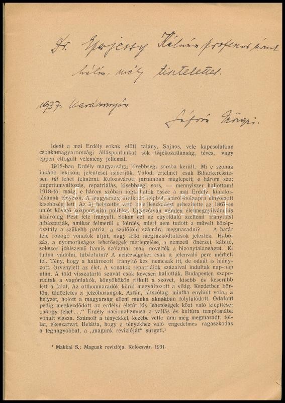 A szerző, Sáfrán Györgyi (1911- 1985) irodalomtörténész, könyvtáros által Eperjessy Géza (1926-1998) történész részére DEDIKÁLT példány.