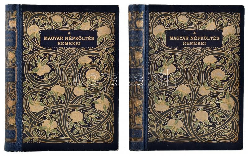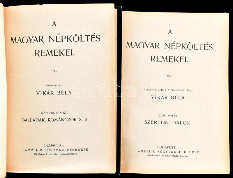 A magyar népköltés remekei I-II. köt. I. köt.: Szerelmi dalok. II. köt.: Balladák, románczok ... stb. Szerk. s a bevezetést írta: Vikár Béla. Bp.,1907,Lampel R. (Wodianer F. és Fiai) Rt.,XXXVIII+287+1 p.+5 (fekete-fehér képtáblák) t.; 319 p.+8 (fekete-fehér képtáblák) t. Kiadói aranyozott, festett szecessziós, indás-virágos díszítésű félvászon-kötésben, a borítón kis kopásnyomokkal.