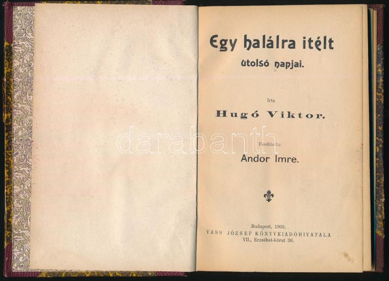 Hugó Victor: Egy halálra ítélt utolsó napjai. Bp., 1903. Vass József. ... https://www.darabanth.com/de/412-Fernauktion/412.0/Bucher/Bucher-Andere-kuriositaten~1000025/Hugo-Victor-Egy-halalra-itelt-utolso-napjai-Bp-1903-Vass-Jozsef-Korabeli-felvaszon-ko~II2538710