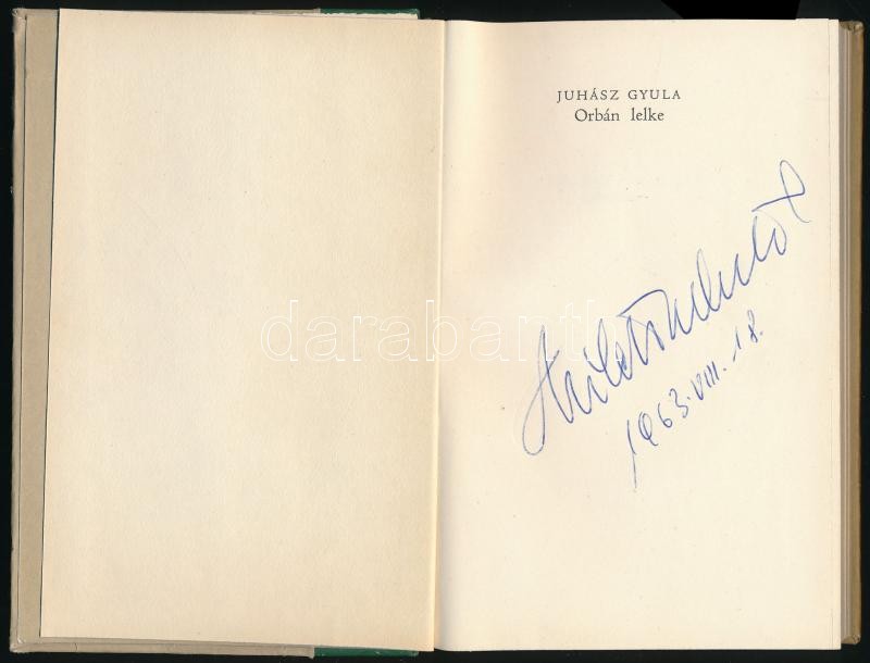 Juhász Gyula: Orbán lelke. Regény. Szalatnai Rezső utószavával. Bp., 1963., Szépirodalmi, 140+2 p.+4 t. Borsos Miklós eredeti rézkarcairól készült ofszet illusztrációival. Kiadói aranyozott gerincű félbőr-kötésben, a borítón kis kopásnyomokkal.