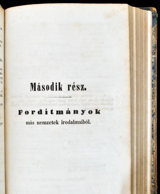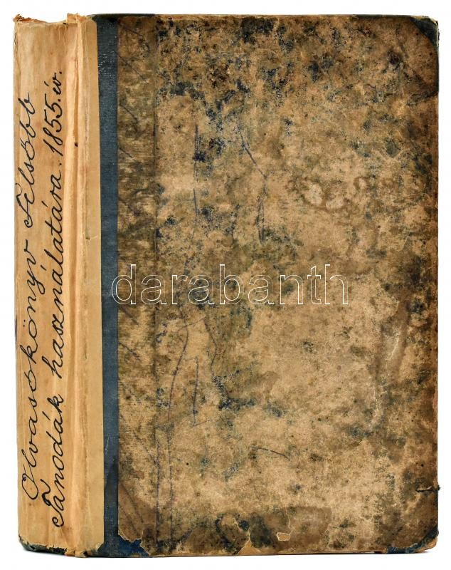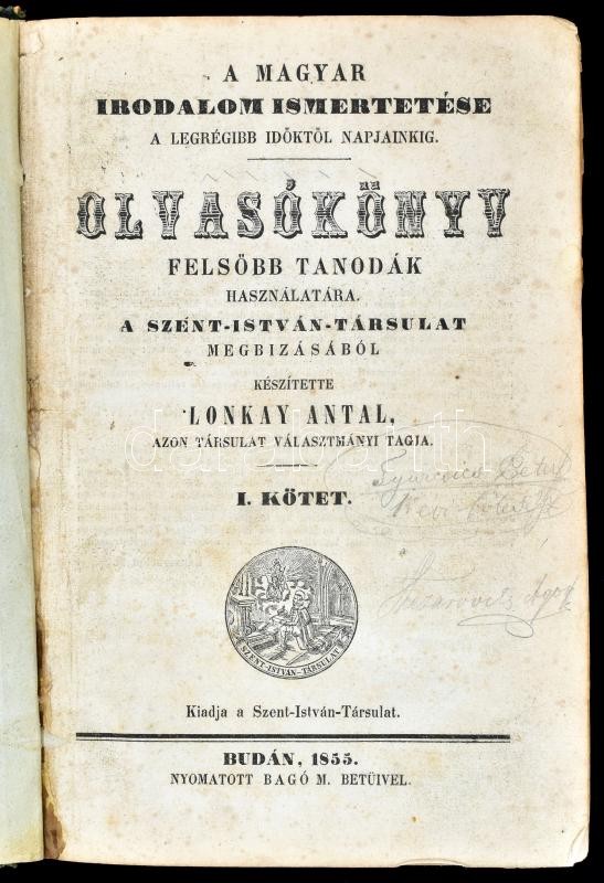 Lonkay Antal: Olvasókönyv felsőbb tanodák használatára a Szent-István-Társulat megbízásából. A magyar irodalom ismertetése a legrégibb időktől napjainkig. Készítette: - - azon társulat választmányi tagja. I. kötet. Buda, 1855., Bagó M., XVI+624 p. Átkötött félvászon-kötés, kopott borítóval, javított, pótolt, sérült gerinccel, foltos lapokkal, a szennylapokon és kötéstáblákon számos jegyzettel és firkával.
