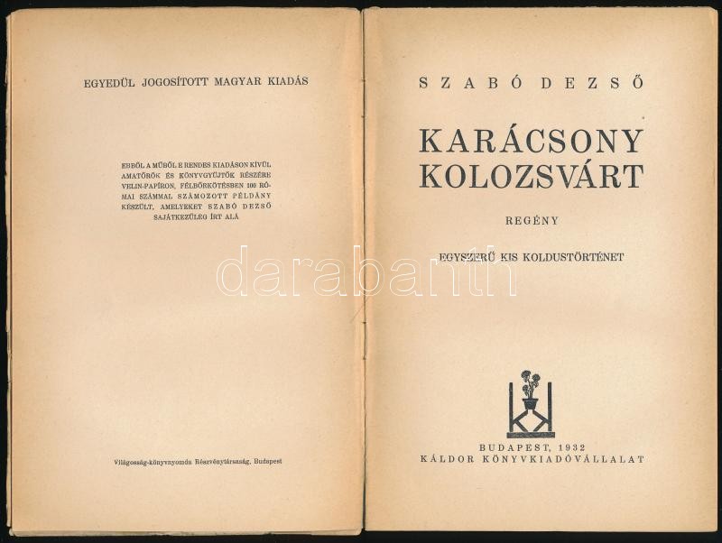 Szabó Dezső: Karácsony Kolozsvárt. Regény. Egyszerű kis koldustörténet. Bp., 1932., Káldor, (Világosság-ny.), 174+1 p. A borító Végh Dezső munkája. Kiadói papírkötés, a gerincen kis sérüléssel, a borító szélein kis szakadással.