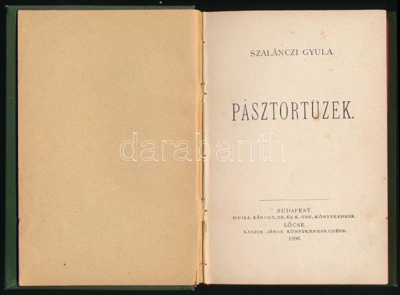 Szalánczi Gyula. Pásztortüzek. Bp.-Lőcse,1896, Grill Károly-Latzin Ján... https://www.darabanth.com/de/412-Fernauktion/412.0/Bucher/Bucher-Andere-kuriositaten~1000025/Szalanczi-Gyula-Pasztortuzek-Bp-Locse-1896-Grill-Karoly-Latzin-Janos-Kiadoi-aranyozott-e~II2566472