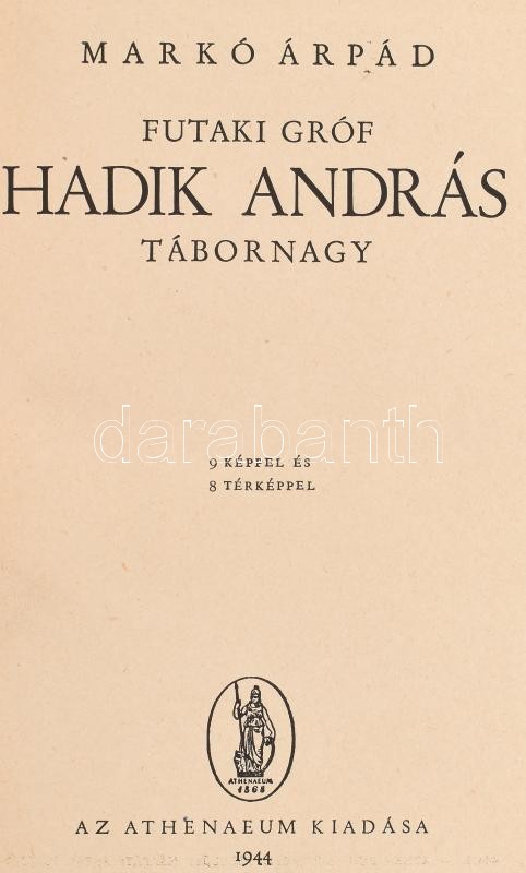 Markó Árpád: Futaki gróf Hadik András tábornagy. Bp., 1944., Athenaeum, 317 p. + VIII (fekete-fehér képtáblák) t. + 1 (kihajtható térkép) t. Oldalszámozáson belül szövegközti és egészoldalas térképekkel illusztrált. Kiadói aranyozott egészvászon-kötés, kissé kopott borítóval.