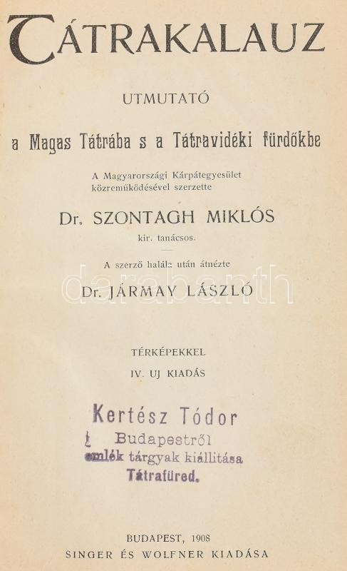 Szontágh Miklós: Tátrakalauz. Utmutató a Magas Tátrába s a Tátravidéki fürdőkbe. A Magyarorsz. Kárpátegyesület közreműködésével szerzette IV. kiadás. Térképekkel.