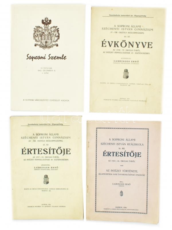 cca 1925-43, 4 db soproni évkönyv: 1943 Soproni Szemle. 7. évf. 1. sz., benne számos érdekes írással. Sopron, 1943, Soproni Városszépítő Egyesület. Kissé laza papírkötésben, egyébként jó állapotban. + Soproni Állami Széchenyi István Gimnázium 63. és 64 sz. értesítője, 1937-38 és 1938-39, papírkötésben, kissé sérült gerinccel. + Soproni Állami Széchenyi István Reáliskola 51 sz. értesítője, 1925-26, papírkötésben, kissé sérült gerinccel.